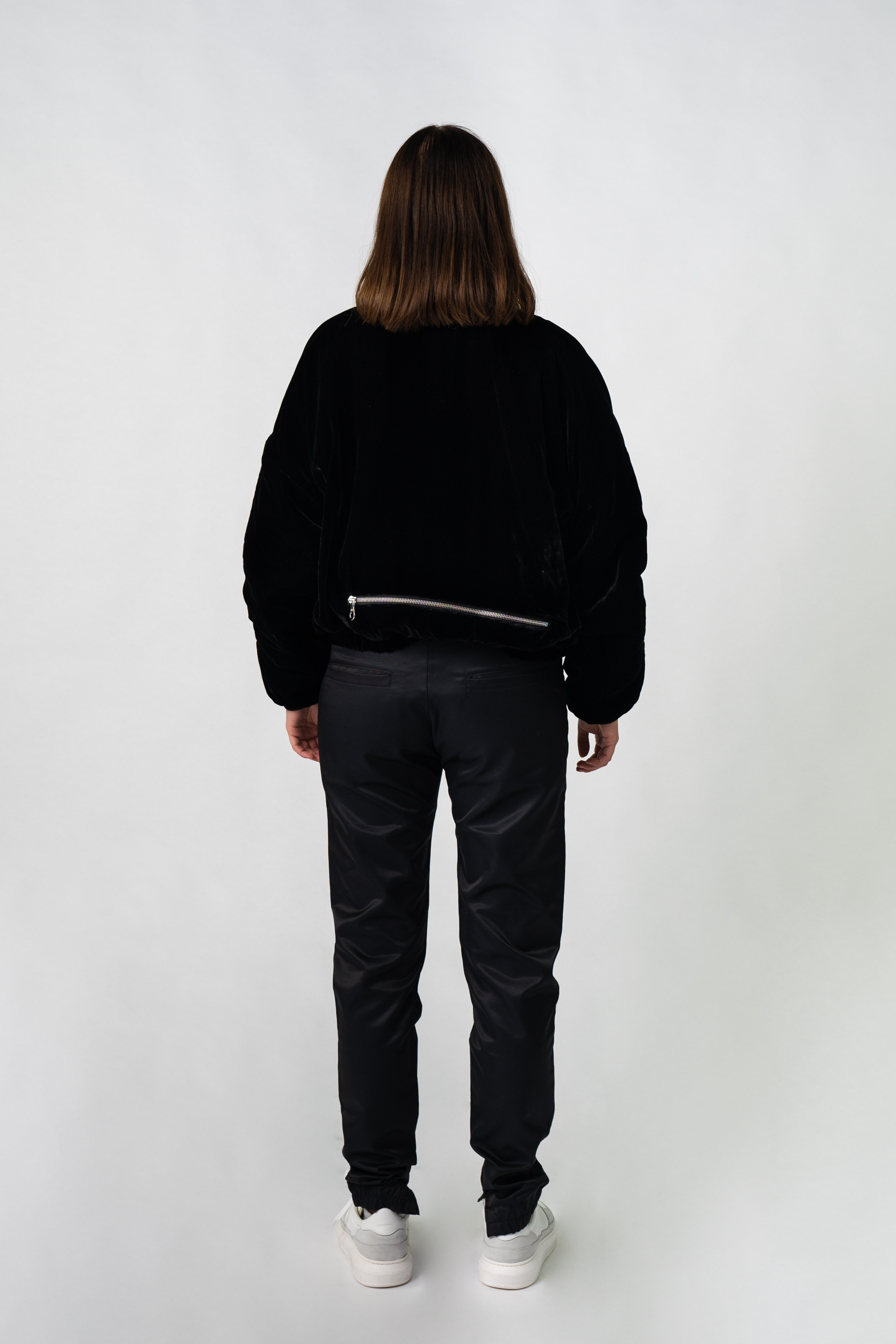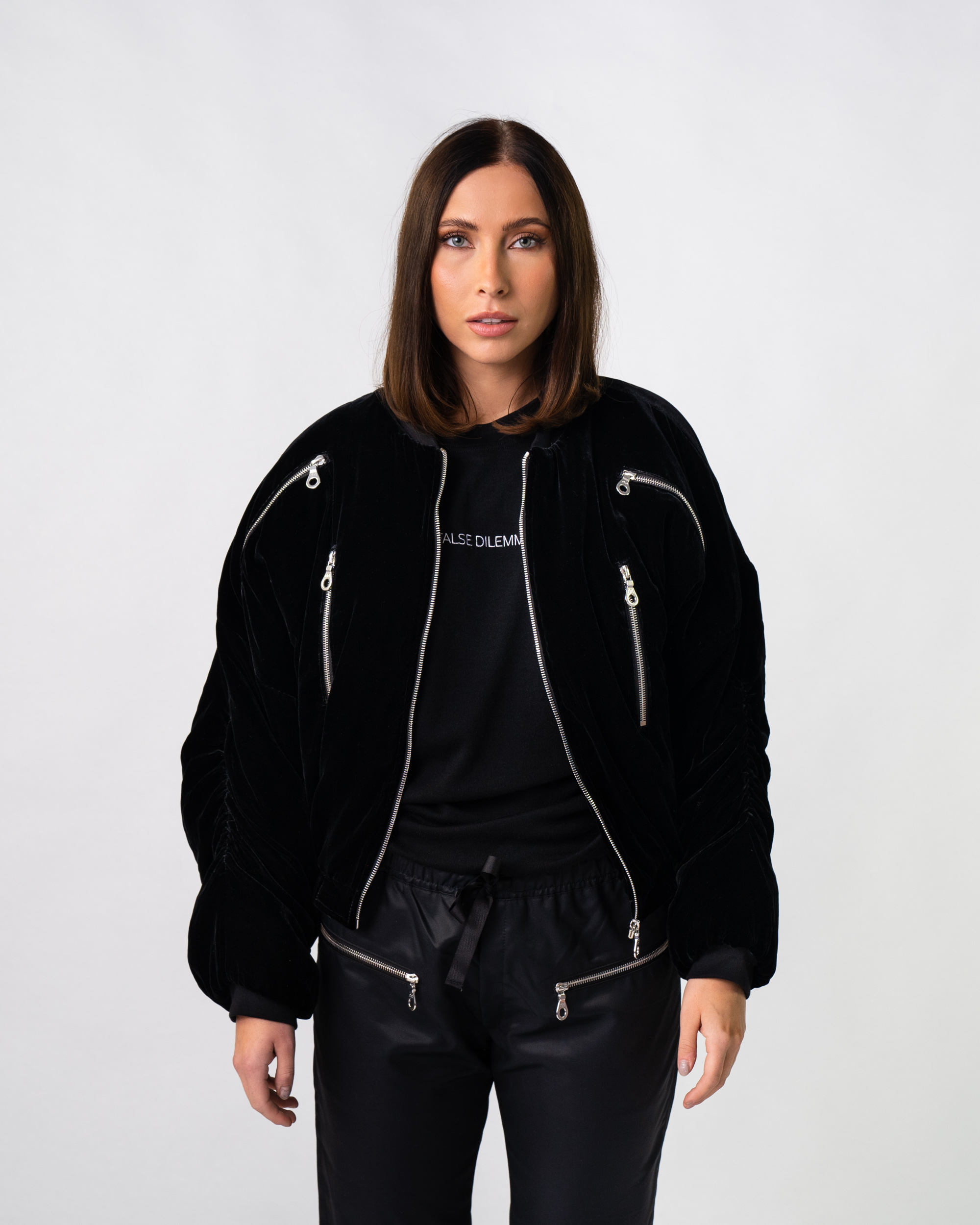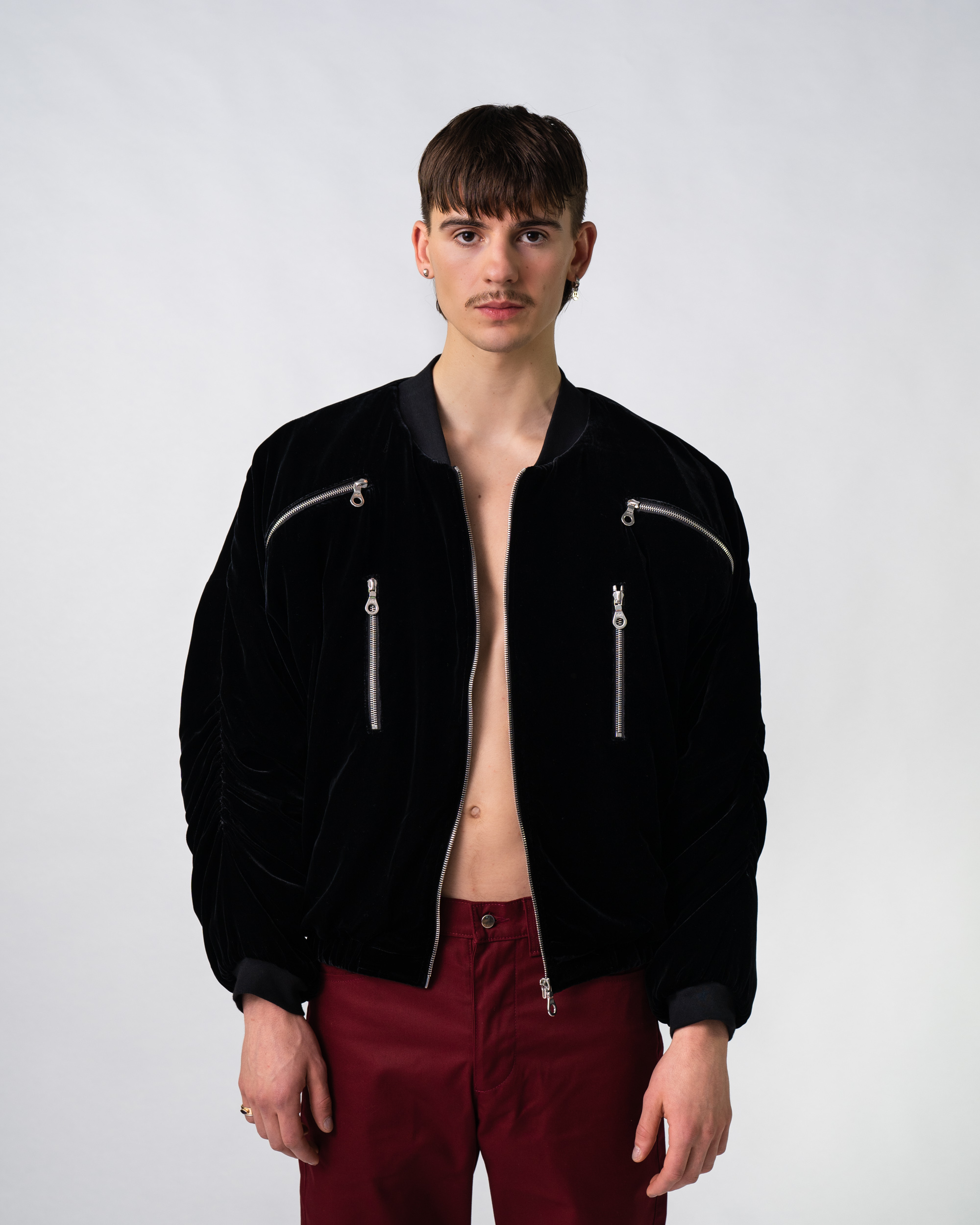 A refined velvet bomber jacket with RIRI zippers. Slightly cropped fit.